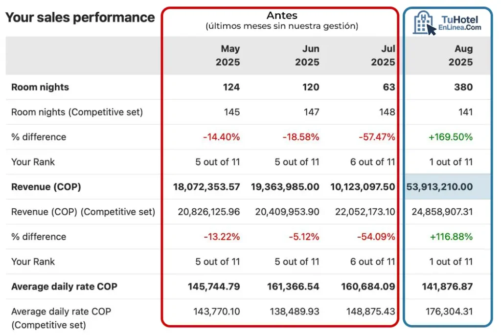 En Tu Hotel En Línea no solo diseñamos estrategias, las convertimos en resultados medibles. Este es el caso de uno de nuestros hoteles aliados, que logró más del 100% de incremento en ventas en pocos meses gracias a nuestro acompañamiento.